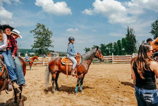 K ježdění využíváme koně amerických plemen Quarter, Paint a Appallosa, kteří vynikají svou klidnou a milou povahou i přesto však dodržujeme bezpečnostní pravidla. Děti jezdí v helmách a vestách, které máme u nás k zapůjčení.